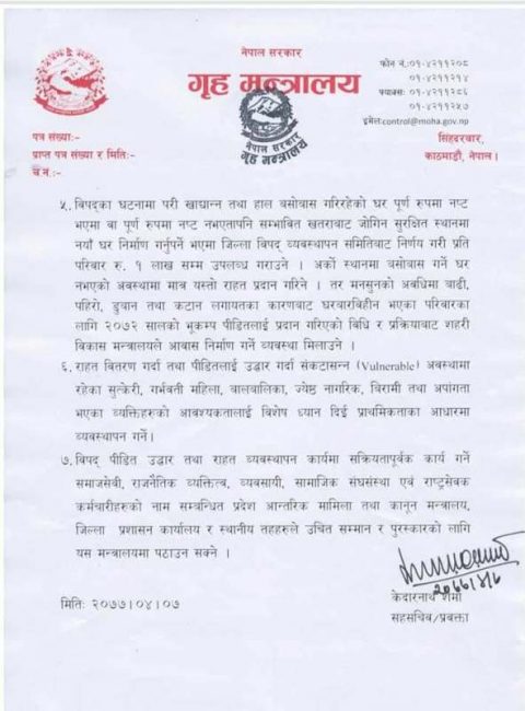 यस्तै एकाघर परिवारका सबै सदस्यको मृत्यु भएमा भने राहत रकम नदिइने मन्त्रालयले जनाएको छ। मन्त्रालयले घर, बहाल, आवास, खाद्यान्न बाली तथा जग्गा जमीन वा पसल व्यवसायमा समेत नोक्सानी भएमा तत्कालका लागि पाँच जनाको परिवार भएमा १५ हजार र सो भन्दा बढी भएमा २० हजार रुपैयाँ राहत उपलब्ध गराउने जनाएको छ। र त्यस्तो राहत रकम सकेसम्म घटनास्थलमै उपलब्ध गराउने बताएको छ।