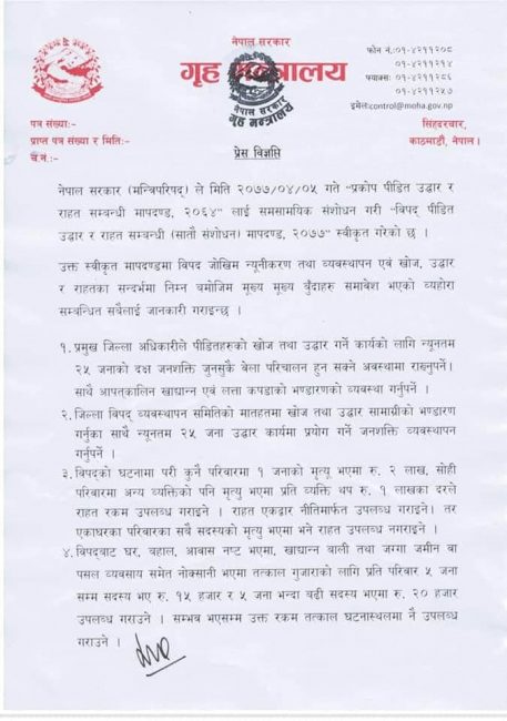 सोमबार बसेको मन्त्रिपरिषद्को बैठकले ‘प्रकोप पीडित उद्धार र राहत सम्बन्धी मापदण्ड, २०६४’ लाई संशोधन गरी ‘विपद् पीडित उद्धार र राहत सम्बन्धी मापदण्ड, २०७७’ स्वीकृत गरेको छ। सोही मापदण्डअनुसार राहत दिइने गृहमन्त्रालयले जनाएको छ।