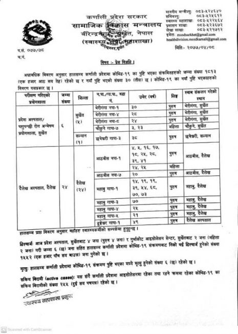 काठमाडौं। सरकारले लकडाउन अन्त्य भएको घोषणा गरेको २४ घण्टा बित्न नपाउँदै कर्णाली प्रदेशको दैलेखबाट कोरोना महामारीको जोखिमपूर्ण समाचार आयो – ट्राभल हिस्ट्री नभएका व्यक्ति पनि कोरोना पोजेटिभ भए।