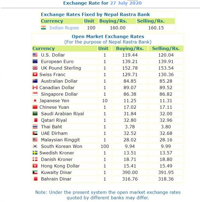 नेपाल राष्ट्र बैंकले दिएको जानकारी अनुसार सोमबार अमेरिकी डलर १ को खरिददर ११९ रुपैँया ४४ पैसा तथा विक्रिदर १२० रुपैयाँ ०४ पैसा रहेको छ। यस्तै यूरोपियन यूरो १को खरिददर १३९ रुपैयाँ २१ पैसा तथा विक्रिदर १३९ रुपैयाँ ९१ पैसा रहेको छ।