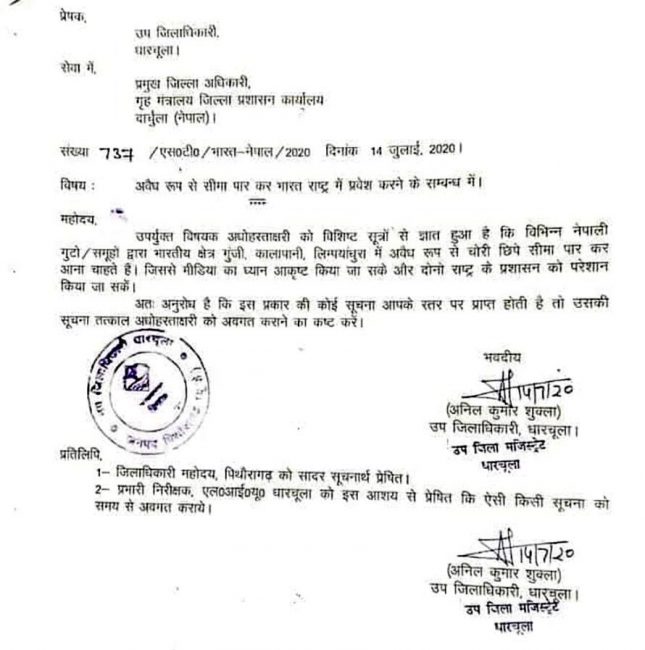 तर, नेपालको नक्सामा समावेस भएका भूमिमा नेपाली नागरिक वा नेपाली सुरक्षाकर्मीलाई प्रवेशमा अवरोध गरिएको छ। भारतीय एसडीएमले दार्चुलाका प्रमुख जिल्ला अधिकारीलाई पत्र लेखेर गुंजी, लिम्पियाधुरा र कालापानीमा अवैध घुसपैठ भएको भन्दै त्यस्तो घुसपैठ रोक्न अनुरोध गरेका छन्। तर, भारतले आफ्नो दावी गरेको यी गाउँ नेपाली हुन्।