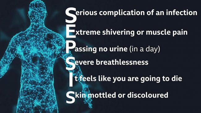 युकेएसटीका संस्थापक डा. रोन डेनियल्सले कोरोनाको हल्का लक्षण भएका बिरामीहरुले पनि सेप्सिसको बारेमा जानकारी राख्नुपर्ने बताएका छन् । डाक्टरहरुका अनुसार सेप्सिस रोग लागेमा बोली लटपटाउने, मानसिक रुपमा अल्मलिने (कन्फ्युजन), मांशपेशी र जोर्नीहरु दुख्ने, पूरै दिनभर पिसाब नलाग्ने, सास फेर्न गम्भीर कठिनाइ हुने, अब म मर्दैछु जस्तो महसुस हुने र छालाको रंग बदलिने जस्ता लक्षण देखिन्छन् । डाक्टरहरुले समयमै रोगको पहिचान भएमा उपचार गरेर स्वस्थ हुन सकिने बताएका छन् ।