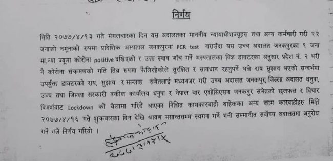 उच्च अदालत जनकपुरमा न्यायाधीश कोरोना संक्रमित भएपछि अदालतको काम रोक्ने निर्णय
