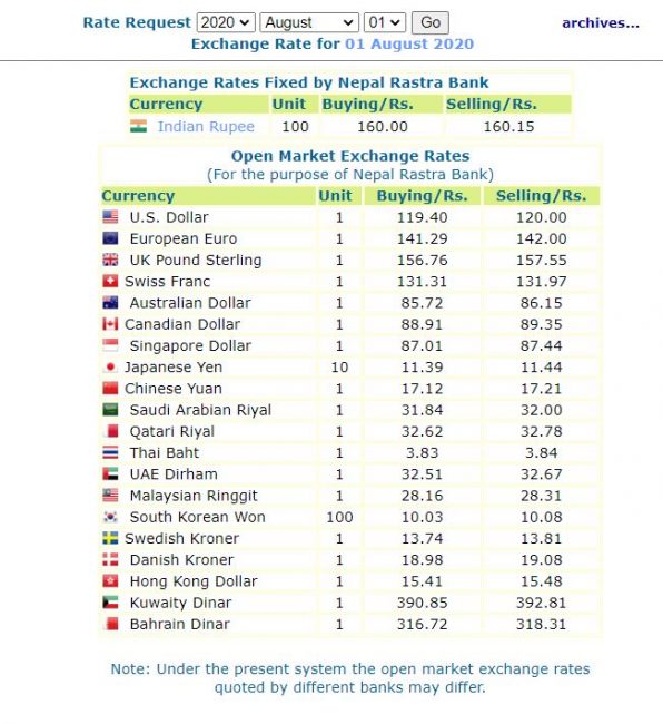 नेपाल राष्ट्र बैंकले दिएको जानकारी अनुसार अमेरिकी डलर १ को खरिददर ११९ रुपैयाँ ४० पैसा, विक्रिदर १२० रुपैयाँ, यूरो १ को खरिददर १४१ रुपैयाँ २९ पैसा, विक्रिदर १४२ रुपैयाँ, पाउण्ड स्टर्लिङ १ को खरिददर १५६ रुपैयाँ ७६ पैसा, विक्रिदर १५७ रुपैयाँ ५५ पैसा रहेको छ।