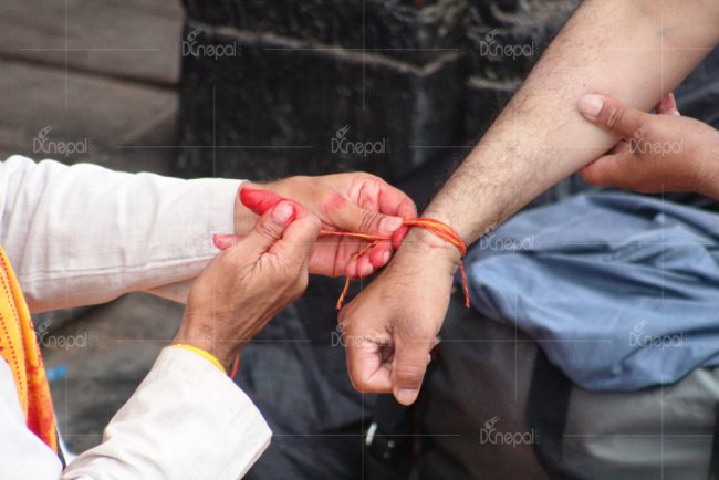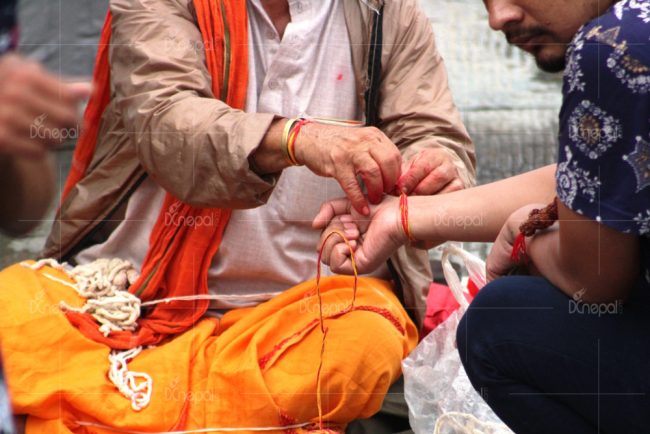पूर्णिमाका दिन बिहानैदेखि वैदिक सनातन धर्मावलम्बीले नदी, ताल, तलाउ, पोखरीमा गई स्नान गरेर गुरु पुरोहितबाट रक्षासूत्र बाँध्छन्। गुरु पुरोहितले विधिपूर्वक मन्त्रिएको यज्ञोपवीत एवं डोरो (रक्षासूत्र) धारण गरेमा नकारात्मक तत्वबाट सुरक्षा प्राप्त हुने धार्मिक विश्वास छ।