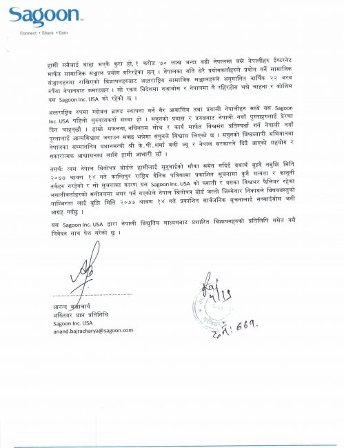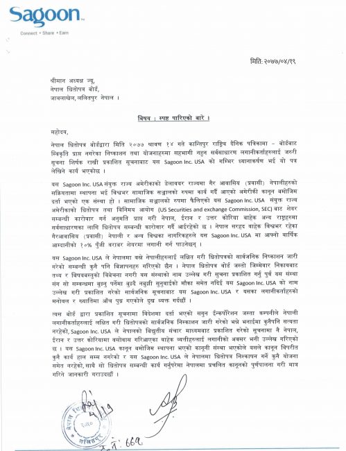 नेपाल धितोपत्र बोर्ड जस्तो जिम्मेवार निकायले बिषयबस्तुको गम्भीरता नबुझि मिति २०७७ श्रावण १४ गते प्रकाशित सार्वजनिक सूचनालाई सच्याईयोस भनी आग्रह समेत गर्दछौ । यसै सिलशिलामा Sagoon Inc. USA ले नेपाल धितोप्रत्र वोर्डलाई स्पष्टीकरण निवेदन (दर्त्ता नं : ७७१) शुद्द बुझाईसकेको छ ।