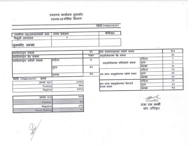 त्यस्तै नुवाकोटका ३२ सय ९२ जनाको आरडिटि परीक्षण गरिएको स्वास्थ्य कार्यालयको नुवाकोटले जानकारी दिएको छ।