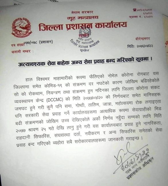 बुधबारसम्म देशका विभिन्न १४ जिल्लामा निषेधाज्ञा जारी गरिएको थियो। बिहीबार गृहमन्त्रालयले थप तीन जिल्लामा निषेधाज्ञा जारी गरिएको जनाएको छ। तर, सुर्खेतमा पनि अत्यावश्यक सेवा बाहेक अन्य सेवा बन्द गरिएको जिल्ला प्रशासन कार्यालय सुर्खेत सूचना जारी गरेको छ।
