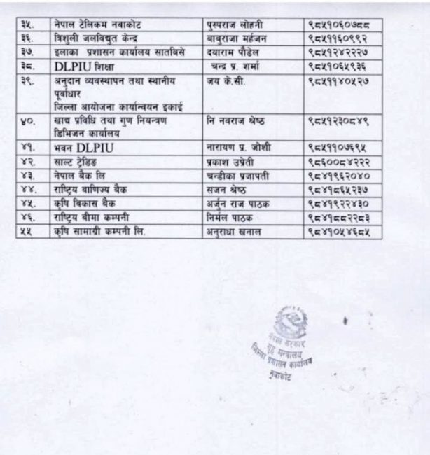 कोरोनाको संक्रमण समुदाय स्तरमा फैलिरहेको हुँदा संक्रमण रोकथाम तथा नियन्त्रणका लागि सेवाग्राहीहरुलाई आफनो कामको विषयमा जानकारी लिई सेवा लिन आउने प्रयोजनको लागि मोवाईल फोनबाट पनि सुचना लिन सकिने प्रमुख जिल्ला अधिकारी झकंनाथ ढकालले जानकारी दिए।