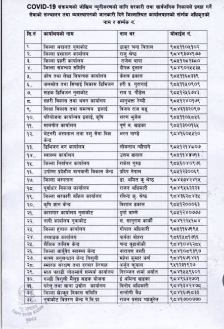 प्रजिअ ढकालका अनुसार समुदायमा कोरोनाको त्रास बढी रहेको हुँदा जिल्लास्थित कार्यालयहरुमा आमनागरिकहरुले सोधपुछको लागि जिल्लाको सबै सरकारी कार्यलयको मोवाईल नम्बर र सम्पर्क व्यक्ति समेत तोकिएको हो। मोबाईलबाट नै धेरै कामहरुको सूचना लिन सरल र सहज हुने भएकोले मोबाईल फोन सेवा सन्चालनमा ल्याईएको उनको भनाई रहेको छ।