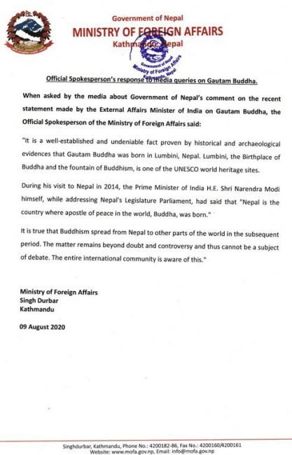 मन्त्रालयका प्रवक्ता भरतराज पौडेलले जारी गरेको विज्ञप्तिमा भनिएको छ, ‘गौतम बुद्धको जन्मस्थान लुम्बिनी नेपाल हो भन्ने कुरा ऐतिहासिक र पुरातात्विक प्रमाणहरुले पुष्टि गरिसकेको छ। राष्ट्र संघीय एजेन्सी यूनेस्कोले पनि लुम्बिनीलाई विश्व सम्पदा सूचीमा राखिसकेको छ। यसमा विवाद गर्नुको कुनै आवश्यकता छैन।’