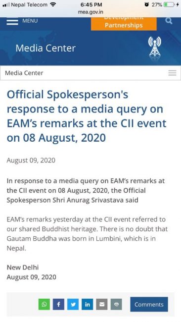 शनिबार भारतीय विदेशमन्त्री जयशंकरले एक भर्चुअल बैठकमा बुद्धलाई महान भारतीय भनेर वर्णन गरेका थिए। उनको सो भनाईको नेपालले विरोध गरेको थियो। नेपालले आइतबार स्टेटमेन्ट जारी गर्दै बुद्ध नेपालमै जन्मिएको ऐतिहासिक र पुरातात्विक प्रमाण रहेको भन्दै यो विवादको विषय नै नभएको बताएको थियो। पररषट्र मन्त्रालयका प्रवक्ता भरतराज पौडेलले स्टेटमेन्ट जारी गरेको केही समयपछि उनका भारतीय समकक्षीले पनि स्टेटमेन्ट जारी गर्दै विदेशमन्त्रीको भनाईलाई सच्याएका हुन्।