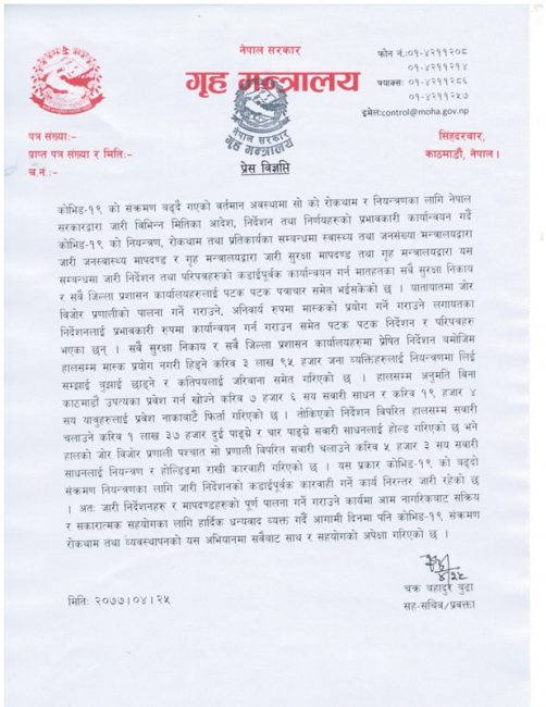मन्त्रालयले मास्क नलगाई भींडभाड हुने ठाउँ र सडकमा निस्कने करिब ३ लाख ९५ हजारलाई कारबाही गरिएको जनाएको छ। मास्क प्रयोग नगर्ने व्यक्तिमध्ये केहिलाई सम्झाई बुझाई छाडेर र कतिपयलाई जरिवाना समेत गरिएको गृहले जनाएको छ।