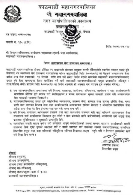 यस निर्णयका आधारमा मंगलबार प्रशासन बिभागले बिभाग, महाशाखा, वडा, आयोजना, इकाइ र सचिवालयलाई परिपत्र गरेको छ। बिभागका प्रमुख नमराज ढकाल भन्छन्, ‘अत्यावश्यक सेवा प्रवाह गर्दा स्वास्थ्य सुरक्षा मापदण्ड पालना गर्नुपर्ने, भीडभाड नहुने गरी कर्मचारी र सेवाग्राहीलाई आलोपालोको व्यवस्था मिलाउने कुरा पत्रमा उल्लेख छ।’ ढकालअनुसार अत्यावश्यक सेवा प्रवाह गर्दा, यसैका आधारमा सजगता अपनाएर सेवा प्रवाह व्यवस्थापन गर्नुपर्नेछ।