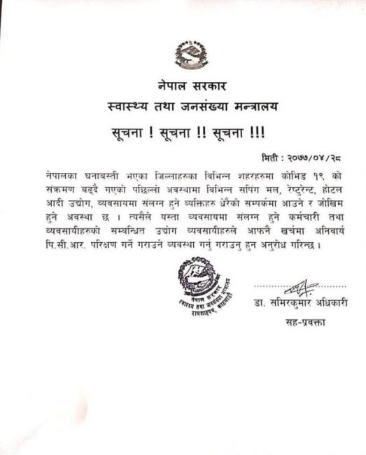 बुधबार स्वास्थ्य तथा जनसंख्या मन्त्रालयले सूचना जारी गर्दै सपिङ्ग मल, होटल रेष्टुरेण्टलगायतका धेरै मानिसको सम्पर्कमा आउने व्यवसायमा रहेका कर्मचारी तथा व्यक्तिहरुलाई आफ्नै खर्चमा पीसीआर परीक्षण गर्न भनेको हो।