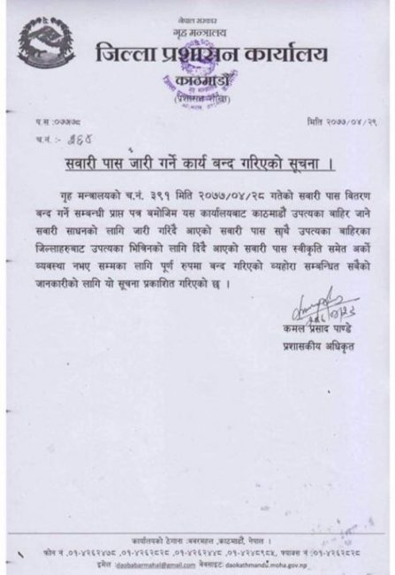 गृहमन्त्रालयले बुधबार देशका ७७ वटै जिल्ला प्रशासनलाई पत्र लेखेर सवारी पास नदिन भनेको थियो। यसअघि लकडाउन कालमा पनि जिल्ला प्रशासनबाट पास लिएर काठमाडौं आउने र बाहिर जाने काम भइरहेको थियो।