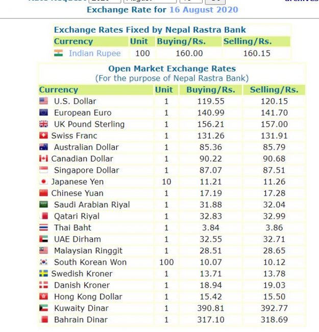 नेपाल राष्ट्र बैंकका अनुसार शनिबार अमेरिकी डलर १ को खरिददर ११९ रुपैयाँ ५५ पैसा विक्रीदर १२० रुपैयाँ १५ पैसा रहेको छ। यूरोपीयन यूरोको खरिददर १४० रुपैयाँ ९९ पैसा, विक्रीदर १४१ रुपैयाँ ७० पैसा रहेको छ।