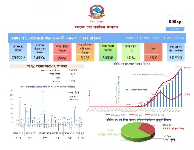 देशभर आइतबारसम्म कोरोना संक्रमित हुनेको संख्या २६ हजार ६६० पुगेको छ। हालसम्म १७ हजार ३ सय ३५ जना डिस्चार्ज भएका छन् भने पछिल्लो २४ घण्टामा १३४ जना डिस्चार्ज भएको स्वास्थ्य तथा जनसंख्या मन्त्रालयले जनाएको छ। नेपालमा हालसम्म सक्रीय संक्रमितको संख्या ८ हजार ७२४ रहेको छ।