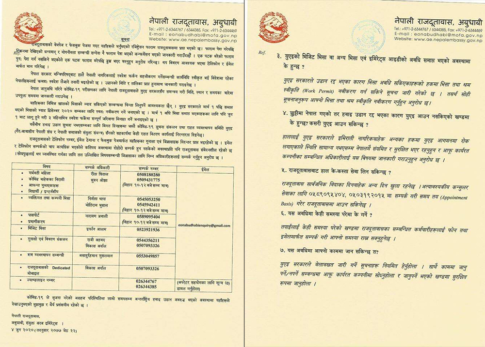 उक्त सूचनामा दूतावासका विभिन्न विभाग हेर्ने कर्मचारीको नामसहित मोबाइल नम्बर, ल्याण्डलाइन नम्बरदेखि इमेल आइडी समेत सार्वजानिक गरिएको थियो। दूतावासले आफ्ना सबै संयन्त्र प्रयोग गरेर कोभिड–१९ विषेश समस्या समाधान गर्न विशेष किसिमले लागेको पनि दावी गर्याे। दूतावासका विभिन्न विभागमा कार्यररत कर्मचारीलाई कोरोनाबाट समस्यामा परेका नेपालीहरुको गुनासोहरु सम्बोधन गर्ने जिम्मेवारी तोकियो। जसमा उपनियोग प्रमुखदेखि दूतावासका सबै कर्मचारीलाई छुट्टाछुट्टै जिम्मेवारी दिइएको थियो।