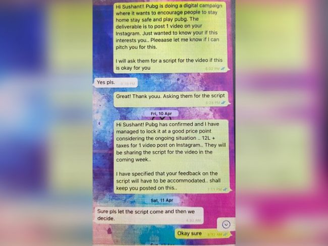 मुम्बइ। बलिउड अभिनेता सुशान्त सिंह राजपुत र उनकी पूर्व म्यानेजर दिशा सलियनको जून महिनामा एक हप्ताभित्रमा मृत्यु भयो । सुशान्तको शव १४ जूनमा बान्द्रास्थित फ्ल्याटमा पंखामा भलुण्डिएको भेटिएको थियो । दिशाले मलाडमा एक फ्ल्याटबाट हाम्फालेर आत्महत्या गरेकी थिइन् । अहिले यी दुईको ह्वाट्सएप च्याटको स्क्रिनसट सार्वजनिक भएको छ जसले यी दुई अप्रिलमा उक अर्कासँग सम्पर्कमा भएको देखाउँछ ।