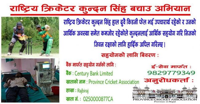 कुन्दन सिंह बचाउ अभियान अन्तर्गत देश बिदेशबाट सहयोग संकलन भई रहेको अवस्थामा प्रदेश २ क्रिकेट संघले कुन्दनका लागि मृगौला दाता खोज्नु पर्ने महत्वपुर्ण रहेको र प्रत्यारोपणको लागि लाग्ने आवश्यक खर्च समेत संघले ब्योहोर्ने श्रेष्ठले बताए ।