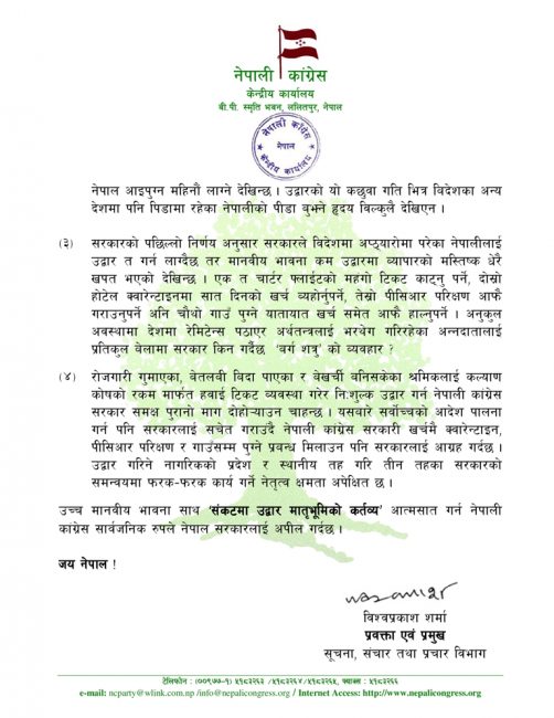 “प्रवासी नेपाली जो जुन देशमा हुन् अप्ठ््यारोमा परेकालाई स्नेह र सहाराको हात दिनु राज्यको दायित्व थियो र हो । राज्यको यो दायित्व बारे काँग्रेसले लिखित र मौखिक रूपमा निरन्तर प्रधानमन्त्रीदेखि मन्त्री हुँदै सम्बन्धित निकाय समक्ष राख्दै आएको छ । छ महिनादेखि बेरोजगार भएर बसेका खाडीका श्रमिकलाई चार्टर फ्लाइटको महङ्गो टिकट खरिद गर भन्नू कति न्यायोचित छ ? सरकारको यो निर्णय सर्वोच्चको गत असार १ को निःशुल्क उद्धार गर भन्ने आदेशको उलङ्घन र अदालतको मानहानी हो कि होइन ?”, विज्ञप्तिमा उल्लेख छ।