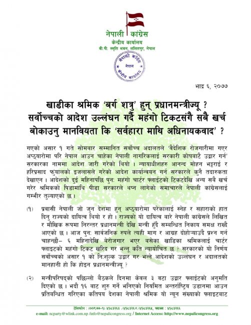 “प्रवासी नेपाली जो जुन देशमा हुन् अप्ठ््यारोमा परेकालाई स्नेह र सहाराको हात दिनु राज्यको दायित्व थियो र हो । राज्यको यो दायित्व बारे काँग्रेसले लिखित र मौखिक रूपमा निरन्तर प्रधानमन्त्रीदेखि मन्त्री हुँदै सम्बन्धित निकाय समक्ष राख्दै आएको छ । छ महिनादेखि बेरोजगार भएर बसेका खाडीका श्रमिकलाई चार्टर फ्लाइटको महङ्गो टिकट खरिद गर भन्नू कति न्यायोचित छ ? सरकारको यो निर्णय सर्वोच्चको गत असार १ को निःशुल्क उद्धार गर भन्ने आदेशको उलङ्घन र अदालतको मानहानी हो कि होइन ?”, विज्ञप्तिमा उल्लेख छ।