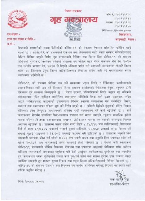 मन्त्रालयले हालसम्म उपत्यका प्रवेश गर्न खोज्ने २० हजार ८७६ जनालाई उपत्यका प्रवेश गर्ने नाकाबाटै फर्काइएको जनाएको छ।