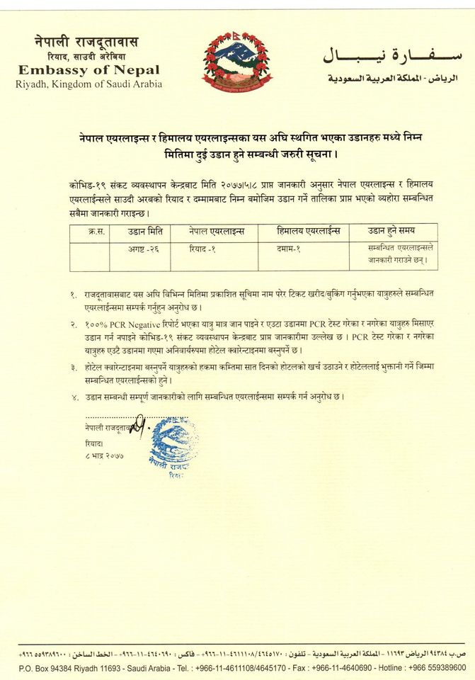 यसअघि दूतावासबाट विभिन्न मितिमा प्रकाशित सूचिमा नाम समावेश भएर टिकट खरिद र बुकिङ गरेका यात्रुहरुलाई सम्बन्धित एयरलाइन्समा सम्पर्क गर्न दूतावासले अनुरोध गरेको छ । त्यस्तै कोरोनाको संक्रमण नभएको नेगेटिभ रिपोर्ट अनिवार्य रुपमा साथमा राख्नुपर्नेछ ।