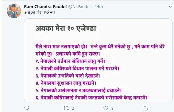 काठमाडौं। काँग्रेस वरिष्ठ नेता रामचन्द्र पौडेलले शनिबार साँझ करिब ६ बजेतिर सामाजिक सञ्जाल फेसबुक र ट्वीटरमा सार्वजनिक गरेको एक पोस्ट डिलिट गरेका छन्। पार्टीको नेतृत्व लिन प्रयासरत पौडेलले पार्टीको आगामी १४ औं महाधिवेशनमा आफूले छलफलका लागि शनिबार १० वटा एजेण्डा सार्वजनिक गरेका थिए। तर, सो एजेण्डाकाको पोस्ट सामाजिक सञ्जालबाट डिलिट गरियो।
