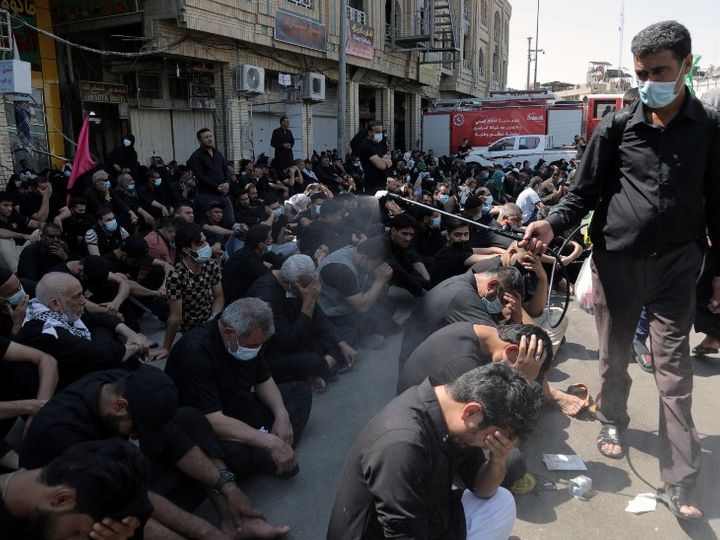 याे फोटो इराककाे हाे। यहाँ करबला जुलूसमा सहभागी भएका शिया मुस्लिममाथि स्यानिटाइटर छर्किँदै कर्मचारी। इराकमा हालसम्म २ लाख ३० हजार भन्दा धेरै संक्रमित भएका छन्।