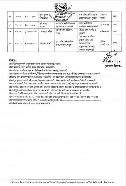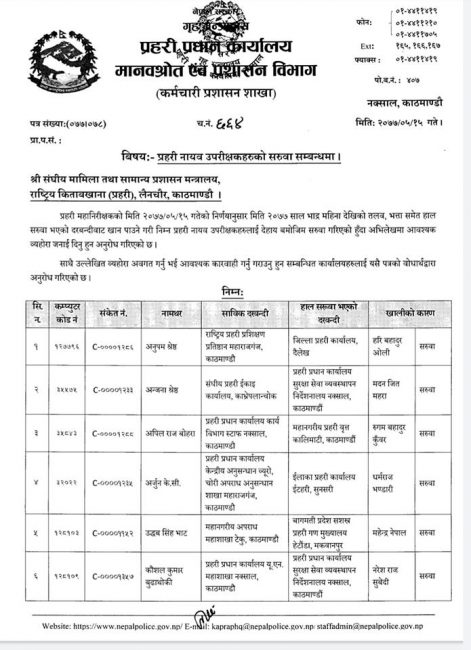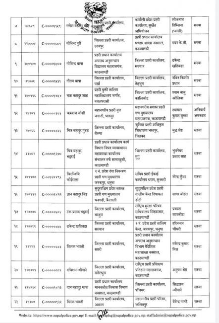 प्रहरी प्रधान कार्यालयको मानव स्रोत एवं प्रशासन विभागले प्रहरी महानिरीक्षकको निर्णय अनुसार डीएसपीहरुको सरुवा गरेको हो। सरुवा अनुसार केही वृत्त र जिल्ला प्रहरी कार्यालयका प्रमुखहरु समेत रहेका छन्।