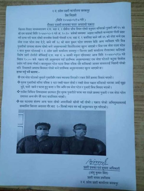 घटना भएको १५ दिनपछि प्रहरीले सो हत्या प्रकणमा संलग्न भएको आरोपमा दुईजनालाई पक्राउ गरेको छ। ६५ वर्षीय पुजारी राम साहको हत्या आरोपमा देवाही गोनाही नगरपालिका १ बस्ने ३६ वर्षीय राम नरेश राउत पटेल र सोही स्थानका २८ वर्षीय बालकुमार पटेललाई प्रहरीले बुधबार पक्राउ गरी सार्वजनिक गरेको छ।