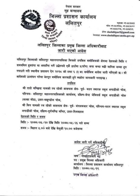 ललितपुरका प्रमुख जिल्ला अधिकारी नारायणप्रसाद भट्टले शुक्रबार अबेर यो आदेश जारी गरेका हुन्। शुक्रबार पनि बिहान ४ बजेदेखि बेलुका १० बजेसम्म कर्फ्यू लगाइएको थियो।
