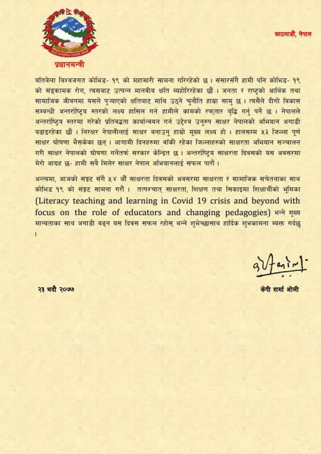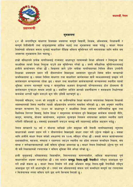 प्रधानमन्त्री ओलीले ५४ औँ अन्तर्राष्ट्रिय साक्षरता दिवसका अवसरमा आज सन्देश दिँदै संविधानले प्रत्येक नागरिकलाई राज्यबाट आधारभूत तहसम्मको शिक्षा अनिवार्य र निःशुल्क तथा माध्यमिक तहको शिक्षा निःशुल्क पाउने हक सुनिश्चित गरेकाले यस्तो संवैधानिक सुनिश्चिततालाई सरकारले कार्यान्वयन गरेको उल्लेख गरे।