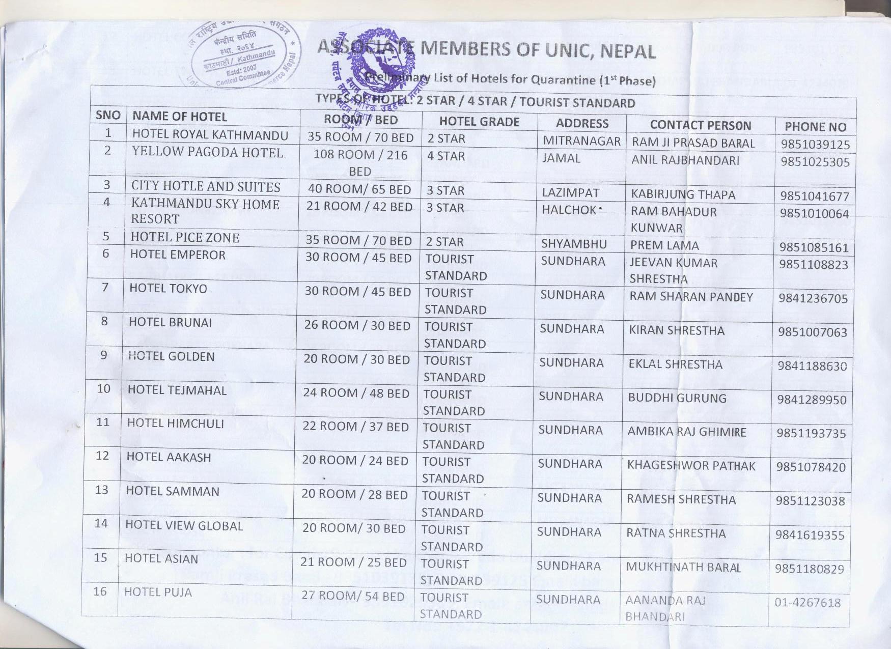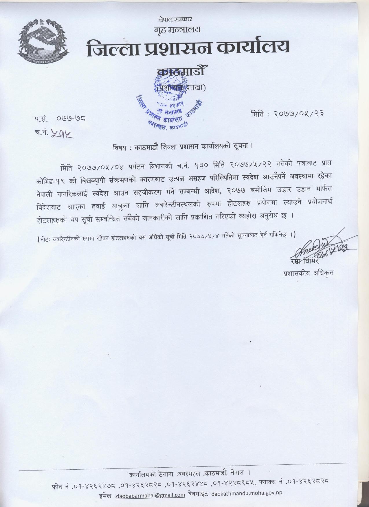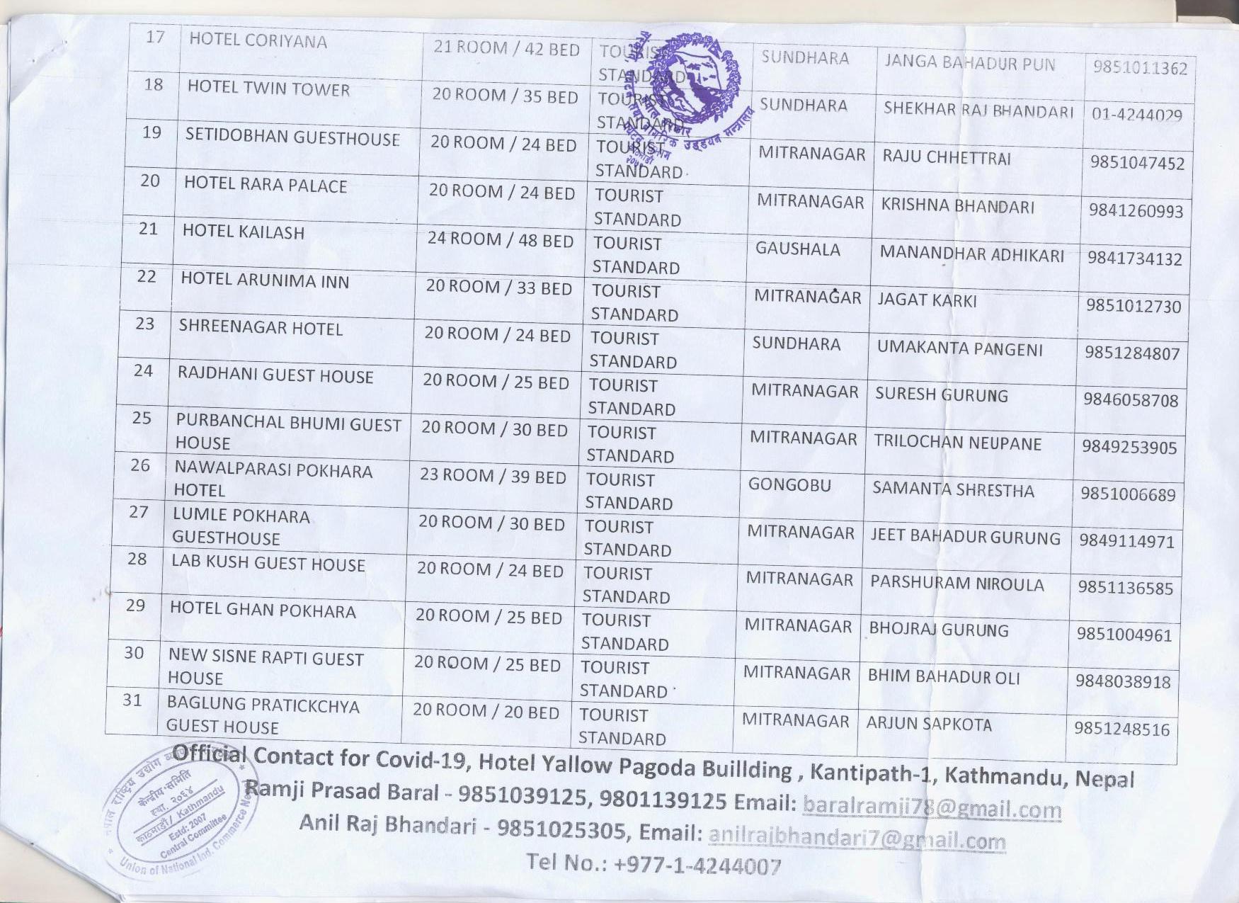 जिल्ला प्रशासन कार्यालय काठमाडौंले मंगलबार एक सूचना जारी गर्दै ३१ होटलको सूची सार्वजानिक गरेको हो । जसमा चार तारेदेखि पर्यटक स्तरीय होटलसम्म समावेश छन् ।
