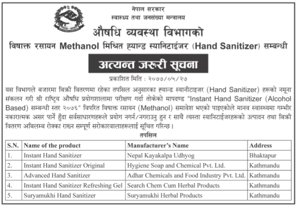 विभागले सूचना जारी गर्दै नेपाल कायाकल्प उद्योग (भक्तपुर)ले उत्पादन गरेको इन्स्ट्यान्ट ह्याण्ड सेनिटाइजर, हाइजेनिक सप एण्ड केमिकल प्रालि (काठमाडौं)ले उत्पादन गर्ने इन्स्ट्यान्ट ह्याण्ड सेनिटाइजर ओरिजिनल, आधर केमिकल एण्ड फूड इन्डस्ट्रीज (काठमाडौं)ले उत्पादन गर्ने एडभान्स हेन्ड सेनिटाइजर, सर्च केम कम हर्वल प्रोडक्टस (काठमाडौं)ले उत्पादन गर्ने इन्स्ट्यान्ट ह्याण्ड सेनिटाइजर रिफ्रेसिङ जेल र सूर्यमुखि हर्वल प्रोडक्टस (काठमाडौं)ले उत्पादन गर्ने सूर्यमुखि ह्याण्ड सेनिटाइजर प्रयोग नगर्न अनुरोध गरेको छ।