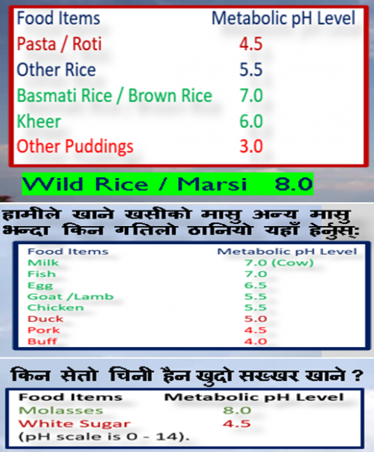 वैज्ञानिकरूपमा हाम्रै भान्सामा नियमित उपलब्ध हुने मरमसला, फलफूल र सिदनहरुको कस्तो मेटाबोलिक क्षारीय पिएच अथवा स्व–हिलिङ क्षमता दिन सक्ने खुबी राख्छ भन्ने कुराले तिनीहरूको औषधीय मूल्य प्रस्ट पार्छ। हाम्रा यी रैथाने खाना कसरी फगत खानामात्र नरहेर औषधीय मूल्यका जडीबुटी हुन् भन्ने प्रश्नको उत्तरसमेत चित्रमा उल्लेख गरिएका डाटाले दिन्छ। यही डाटा किन हाम्रो आयुर्वेदिक चिकित्सा पद्दति हिजो पनि उत्कृष्ट थियो र अबको नयाँ पुस्ताको समेत सबैभन्दा रोजिएको विषय बन्ने छ भन्ने अवस्था इङ्गित गर्न पर्याप्त छ।