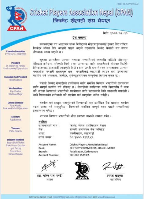 घाईते क्रिकेट खेलाडीलाई सहयोग गर्न सिप्यानको अनुरोध