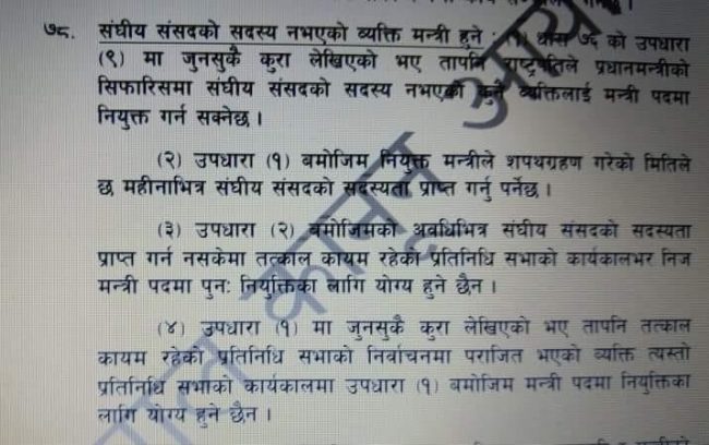 नेकपाले केपी शर्मा ओलीको नेतृत्वमा रहेको सरकारमा मन्त्रिमण्डलको फेरवदल गर्ने गृहकार्य भइरहेको बेला संविधानको मर्मको कुरा उठाएर दुवैजना प्रतिनिधिसभाको यो कार्यकालमा मन्त्री बन्न नपाउने भएका हुन्।