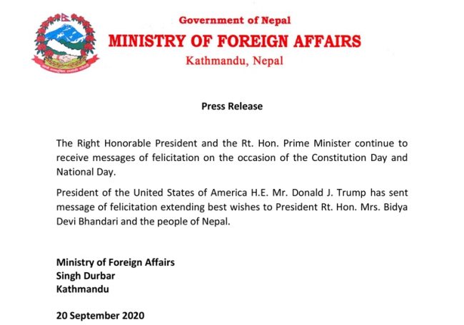 परराष्ट्र मन्त्रालयले संविधान दिवसका अवससरमा विदेशी राष्ट्र तथा सरकार प्रमुखबाट शुभकामना सन्देश आउनेक्रम जारी रहेको जनाएको छ।