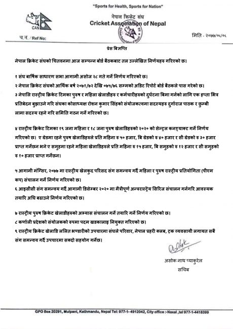 खेलाडीको क्लोज क्याम्पका लागि राष्ट्रिय खेलकुद परिषद् (राखेप)सँग अनुमतिको लागि पहल गर्ने र मंसिर भित्र महिला र पुरुषको प्रधानमन्त्री कप क्रिकेट गर्नका लागि राखेपसँग समन्वय गर्ने निर्णय समेत बैठकले गरेको छ।