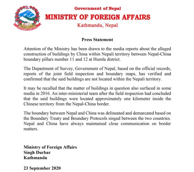 यसैबीच परराष्ट्र मन्त्रालयले बुधबार साँझ स्टेटमेन्ट जारी गर्दै चीनले नेपाली भूमिमा नभई आफ्नै भूमिमा भवन बनाएको जनाएको छ। र चीनसँग कुनै सीमा विावद नरहेको जनाएको छ।