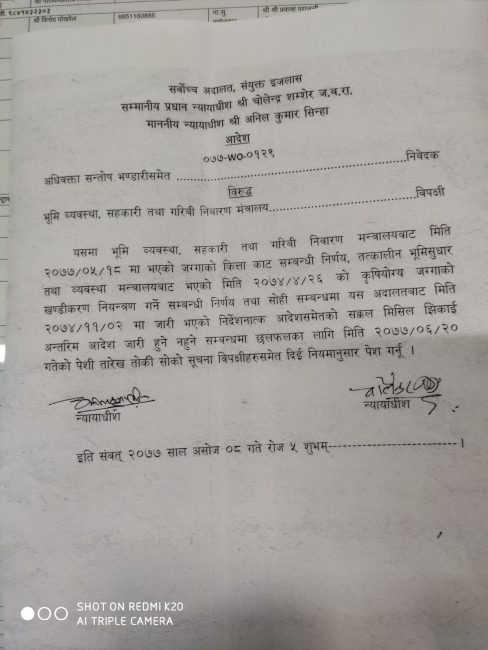 २०७४ फागुृन ११ देखि बन्द रहेको जग्गाको कित्ताकाट गएको भदौ १८ गते खुला गरिएपछि सर्वोच्चमा परेको रिटमाथि सुनुवाई गर्दै सर्वोच्चले बिहीबार यस्तो आदेश दिएको हो।