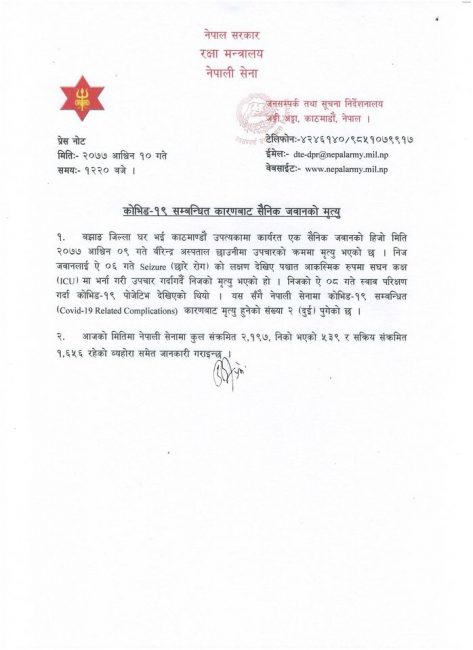 उनलाईअस्पतालको सघन उपचार कक्षमा राखिएको अवस्थामै निधन भएको सैनिक जनसम्पर्क निर्दैशनालयले जनाएको छ। याेसँगै नेपाली सेनामा काेराेना संक्रमणबाट मृत्यु हुनेकाे संख्या २ पुगेकाे छ।