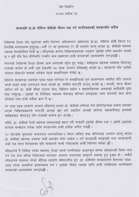आइतबार विज्ञ्यीप्ती निकालेर उनिहरुले डा. केसीको गिर्दो स्वास्थ्यअवस्थालाई ख्याल गरी तत्कालै उनको जीवन रक्षा र उनले उठाएका मागहरु सम्बोधनगर्नकालागि सरकारसँग अपील गरेका छन्।