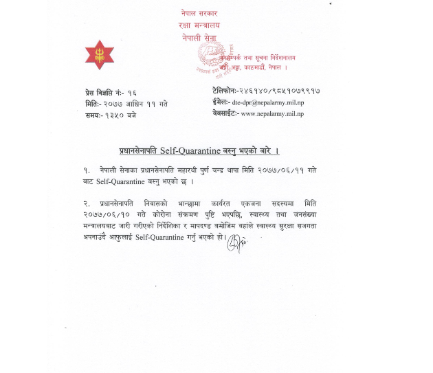 प्रधानसेनापति थापाको सरकारी निवासको भान्छामा कार्यरत एक जनालाई शनिबार कोरोना संक्रमण पुष्टि भएको थियो। ‘उहाँको सरकारी निवासमा भान्छामा कार्यरत एक जनामा कोरोना पुष्टि भएपछि उहाँ आजदेखि सेल्फ क्वारेन्टाइनमा बस्नु भएको हो,’ सैनिक प्रवक्ता सहायकरथी सन्तोष बल्लभ पौडेलले डिसी नेपालसँग भने, ‘पाँच दिन क्यारेन्टिन पूरा गरेर छैटौं दिन पीसीआर टेस्ट गर्ने स्वास्थ्य मापदण्ड छ।’