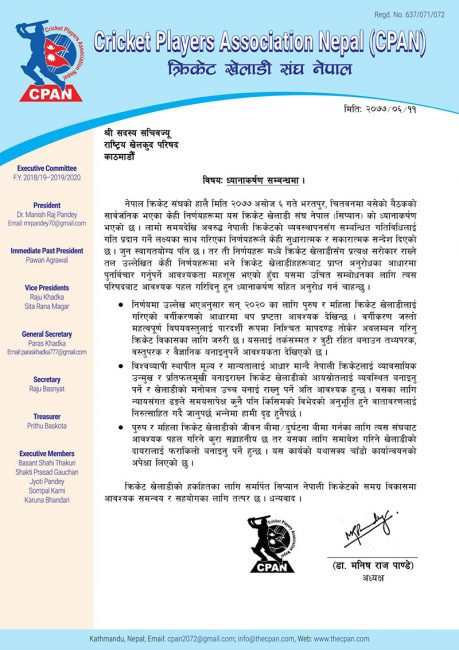सीप्यानले नेपाल क्रिकेट संघ (क्यान) र राष्ट्रिय खेलकुद परिषद् (राखेप) समक्ष वर्गीकरणमा बिषयमा खेलाडीको अनुरोधका आधारमा निर्णय पुनर्विचार गर्न ध्यानकर्षण गराएको हो ।