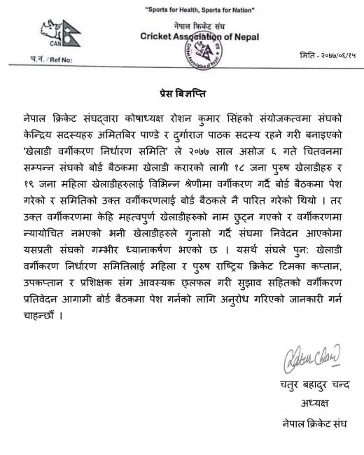 क्यानले बिहीवार जारी गरेको बिज्ञप्तीमा वर्गीकरणमा केही महत्वपूर्ण खेलाडीहरुको नाम छुटेको तथा र वर्गीकरणमा न्यायोचित नभएको भन्दै खेलाडीहरुको गुनासो आएको जनाएको छ । तसर्थ क्यानले पुनः वर्गीकरण निर्धारण समितिलाई महिला र पुरुष टोलीका कप्तान, उपकप्तान र प्रशिक्षकहरुसँग छलफल गरि सुझाव सहितको प्रतिवेदन आगामी बोर्ड बैठकमा पेश गर्नको लागि आग्रह गरेको बिज्ञप्तीमा जनाईएको छ ।