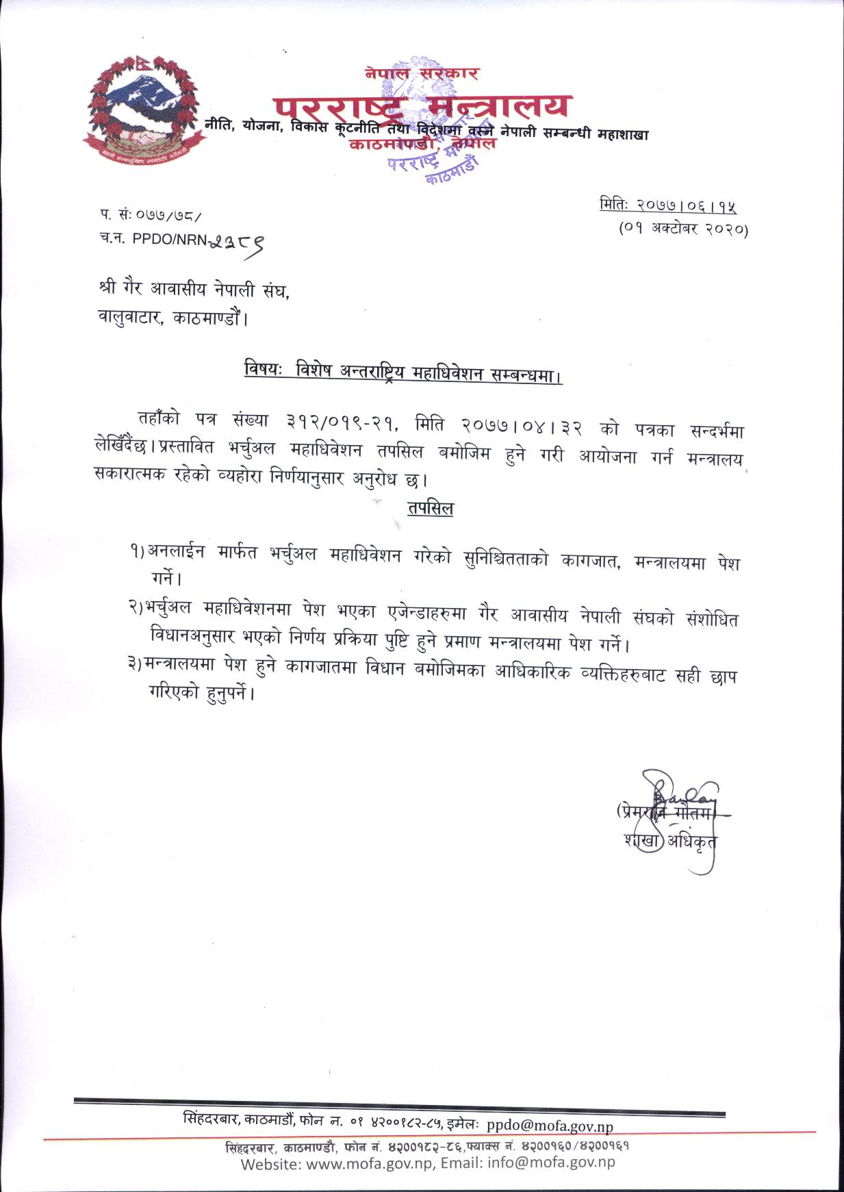 परराष्ट्र मन्त्रालयद्वारा संघलाई पठाएको पत्रमा अन्तर्राष्ट्रिय अधिवेशन अनलाइन भोटिङका आधारमा गर्न सकिने जनाइएको छ ।